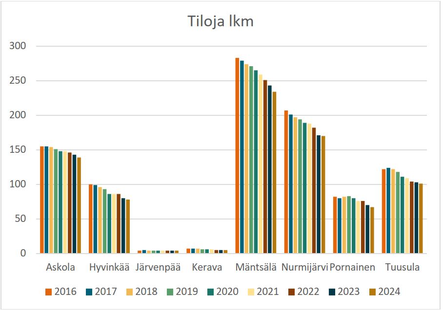 Kaiken kaikkiaan Keski-Uudenmaan yhteistoiminta-alueeltamme löytyy reilu 750 tilaa. Tilalukumäärän kehitys on ollut viime vuosina aleneva koko Suomessa, mutta samaan aikaan tilakoko on kasvanut.